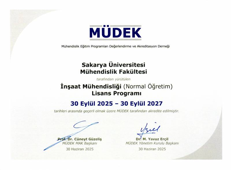 Civil Engineering Undergraduate Program conducted by Sakarya University Faculty of Engineering has been accredited by MÜDEK (Engineering Education Programs Evaluation and Accreditation Association) to be valid between 30 September 2025 and 30 September 2027.