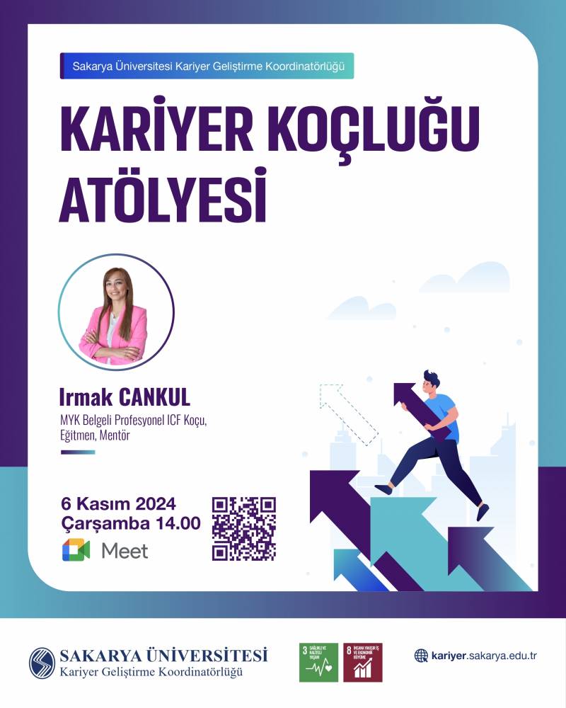 Sakarya Üniversitesi Kariyer Geliştirme Koordinatörlüğü tarafından öğrenciler için 6 Kasım 2024 Çarşamba günü saat 14.00'te 'Kariyer Koçluğu Atölyesi' konulu online etkinlik gerçekleştirilecektir. Etkinlikte Mesleki Yeterlilik (MYK) Belgeli Profesyonel ICF Koçu (International Coaching Federation) Irmak CANKUL yer alacaktır. Afiş üzerindeki QR kodu okutarak etkinliğe giriş yapılabilir.