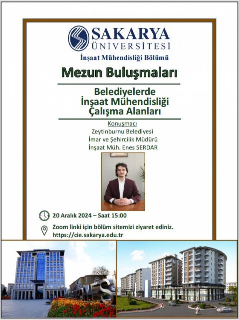 Zeytinburnu Belediyesi İmar Müdürü ve değerli mezunumuz İnşaat Mühendisi Enes Serdar, belediyelerde bir inşaat mühendisinin çalışma alanlarını ve bu alandaki deneyimlerini bizlerle paylaşacak.